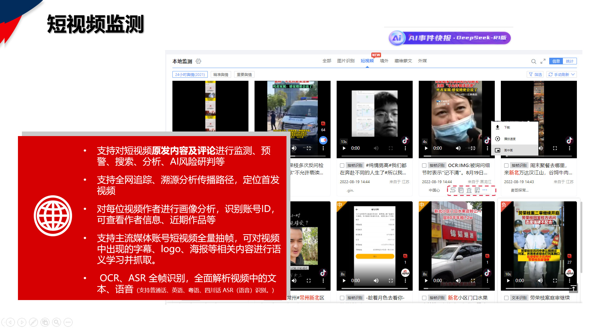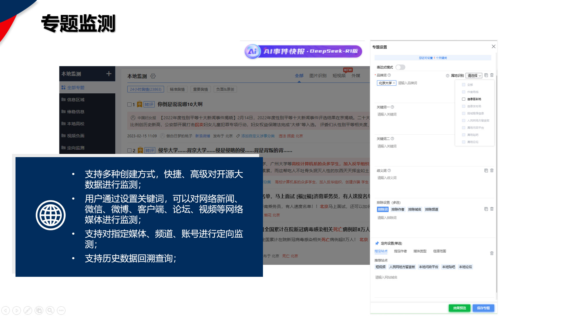 舆情监测:实时全网扫描品牌及关联信息,提升舆情感知力,助力危机快速化解。核心功能:品牌监测、定向监测、OCR识别、AI风险识别/研判、AI解图、AI创作识别。