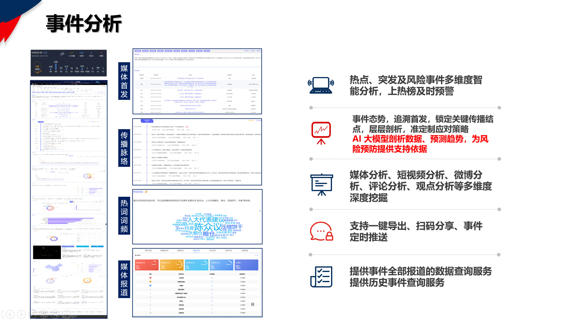 事件分析:针对热点/突发事件,快速生成数据报告。智能模型解析舆情态势与走势;统计分析媒体阵营观点,AI聚合呈现社会情绪。