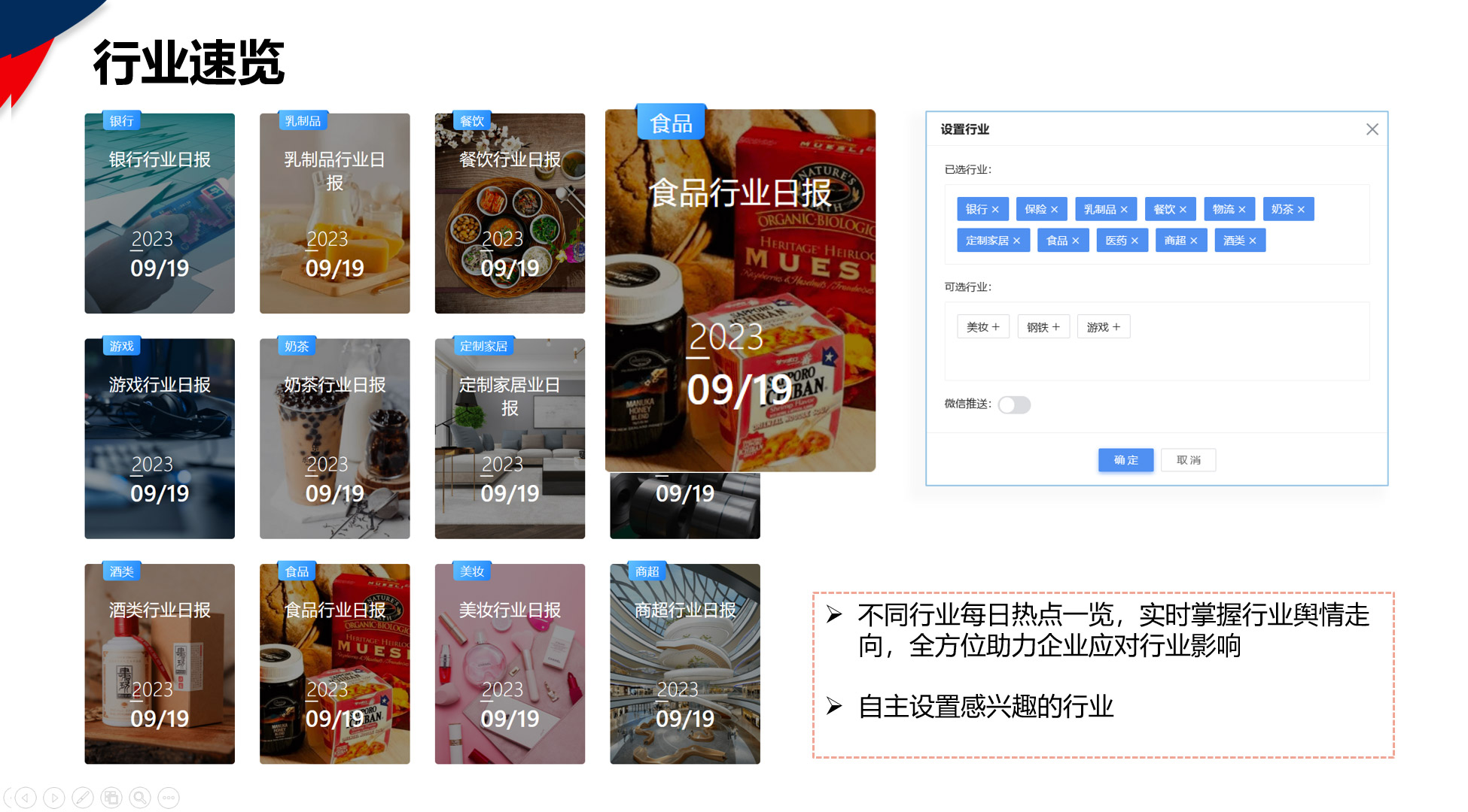 行业速览:提供银行、保险、乳制品、物流等14大行业专业日报,涵盖监管政策、重要新闻、头部企业动态,助您轻松掌握行业脉搏。