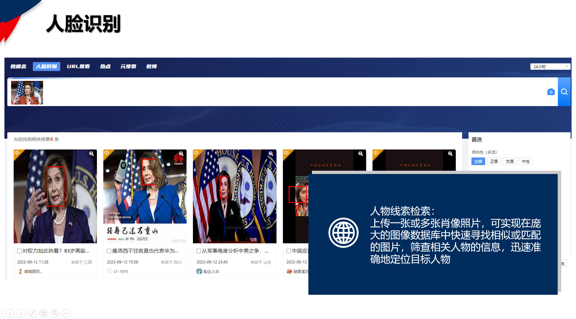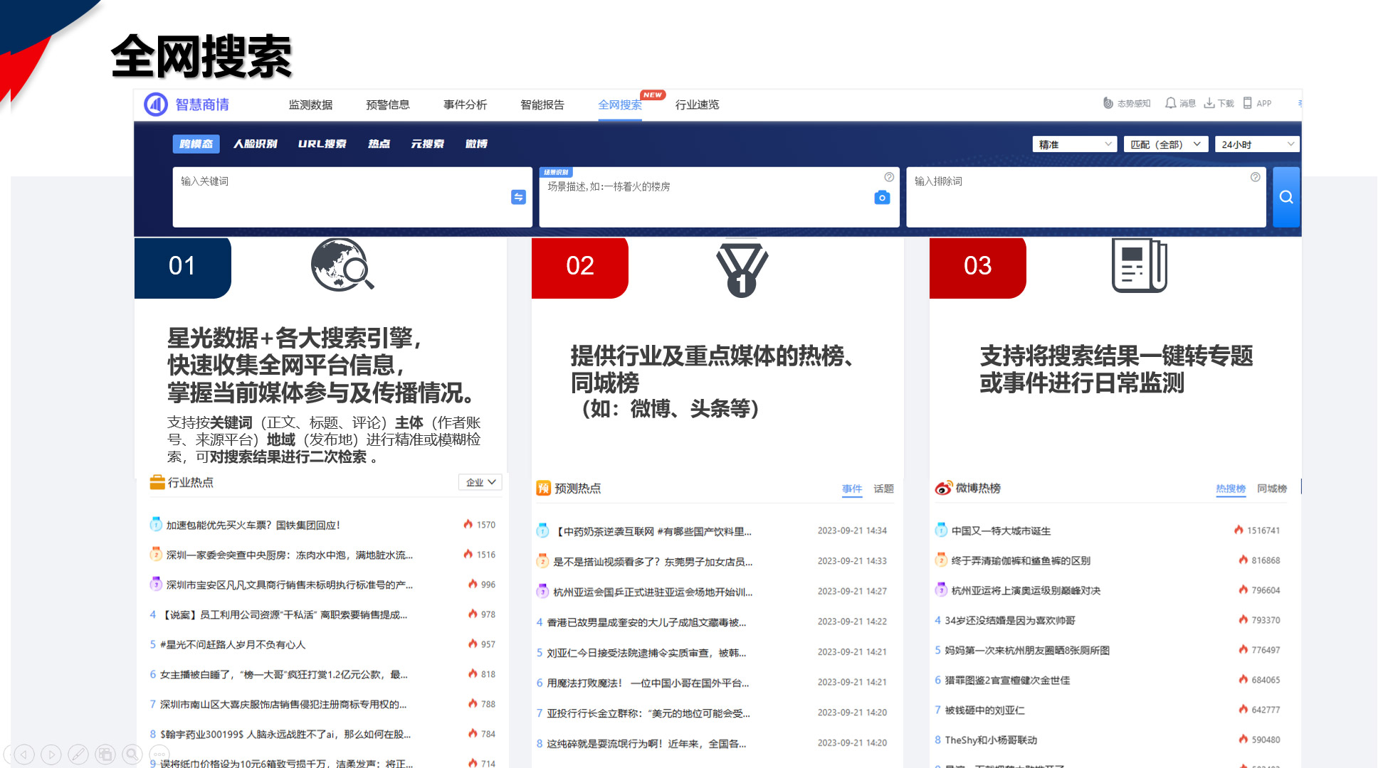 全网搜索:快速收集全网焦点舆情信息,掌握媒体参与度与传播链路。支持星光数据库、以图搜图、人脸识别、热点搜索等强大功能。