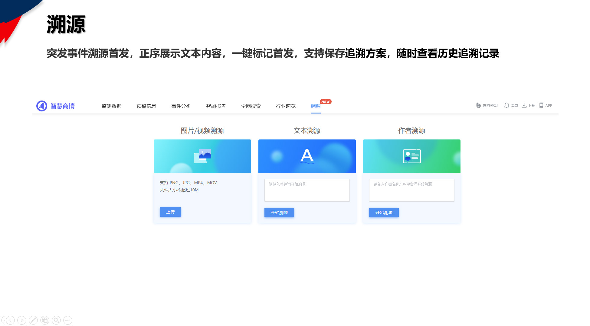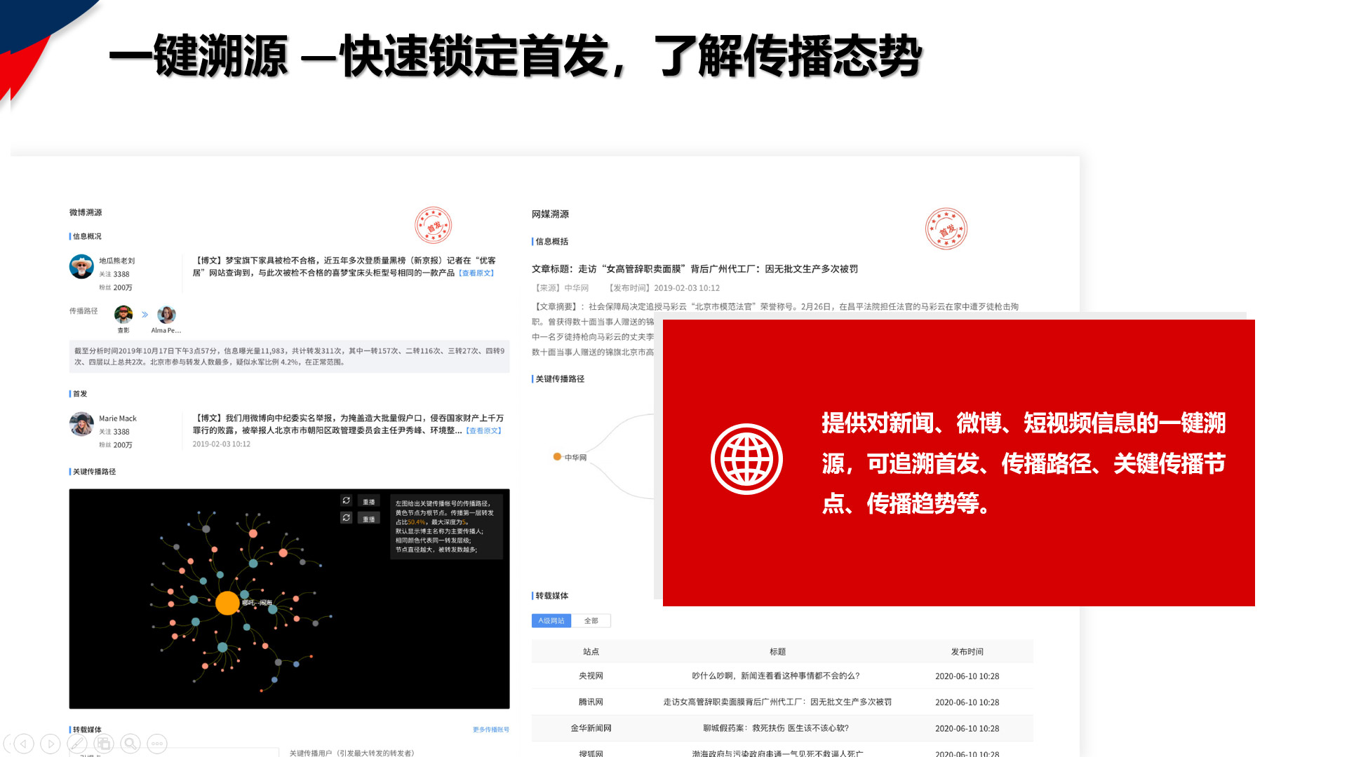 溯源分析:快速定位图文/视频首发源头,完整保存溯源路径。支持通过昵称/平台号精准定位目标账号,实现风险账号定向监测。
