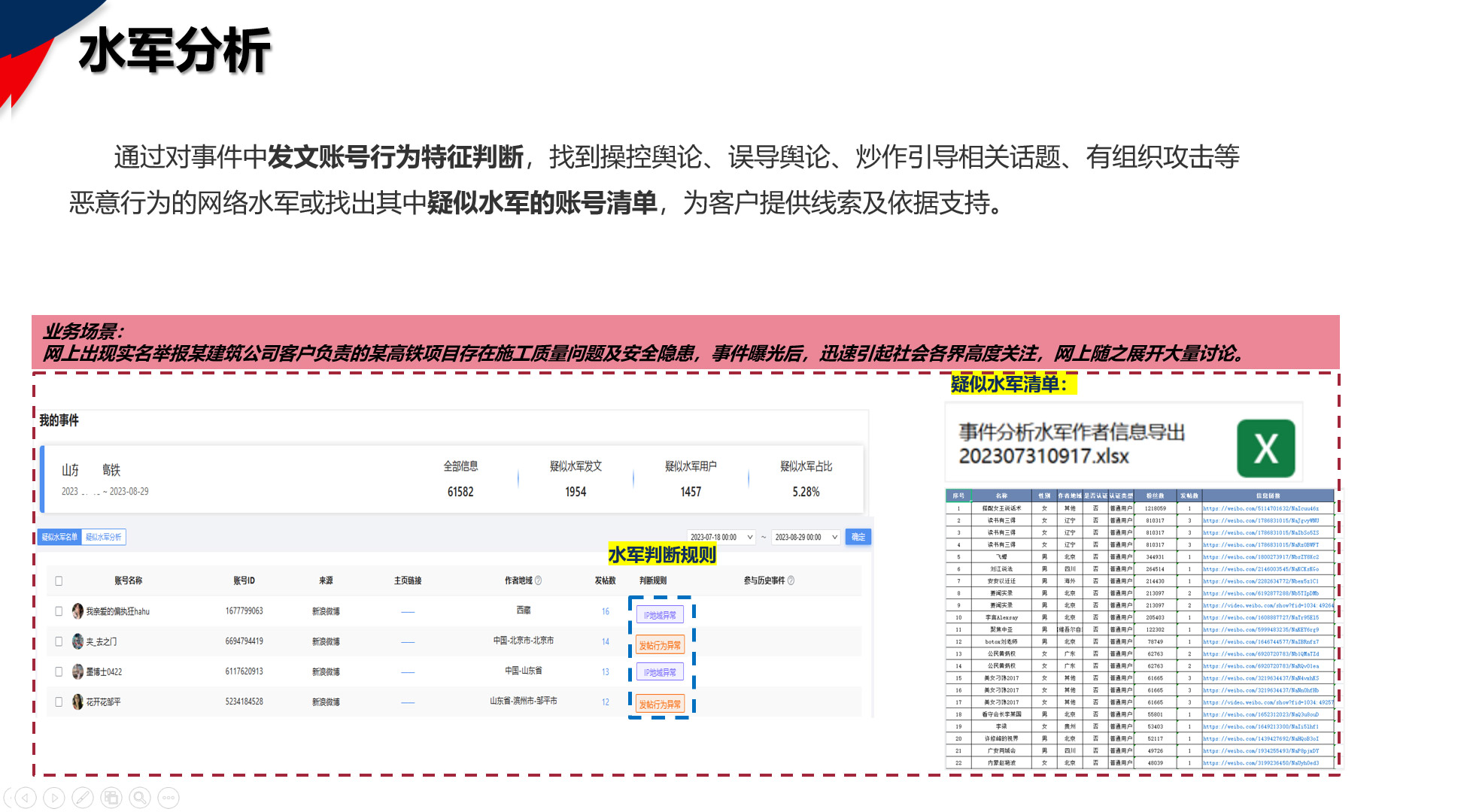 水军识别:基于账号行为特征,精准识别操控舆论、误导传播、炒作话题、有组织攻击的网络水军,提供有力线索支持快速处置。