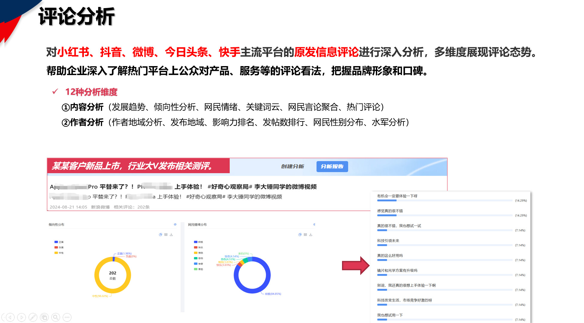 评论分析:深度解析微博、头条、快手、小红书、抖音等平台评论(输入URL即可),多维度展示传播趋势与舆论风向。