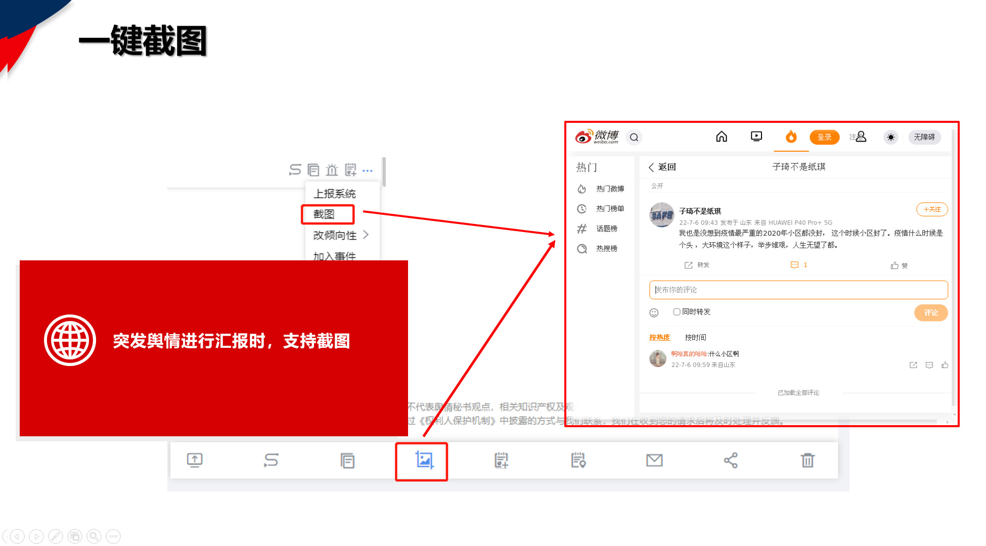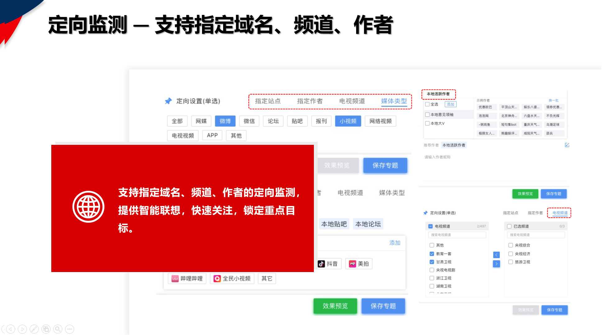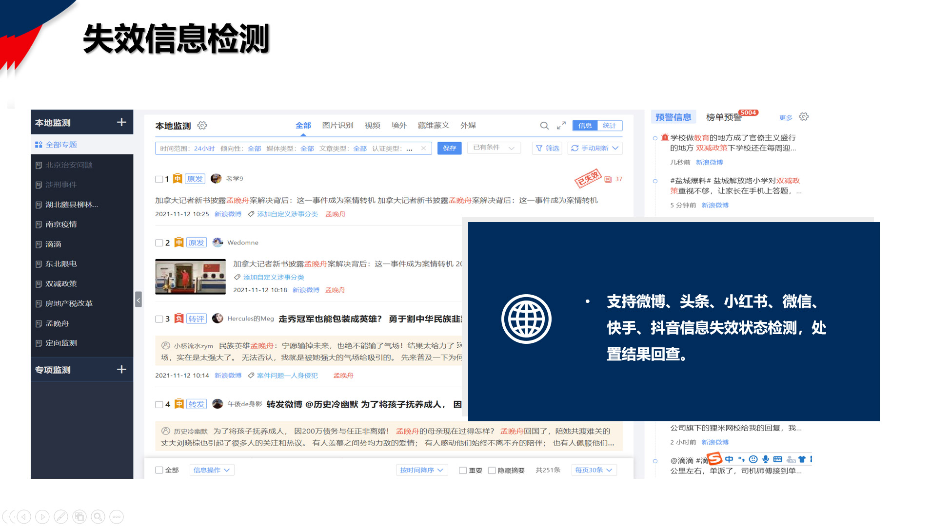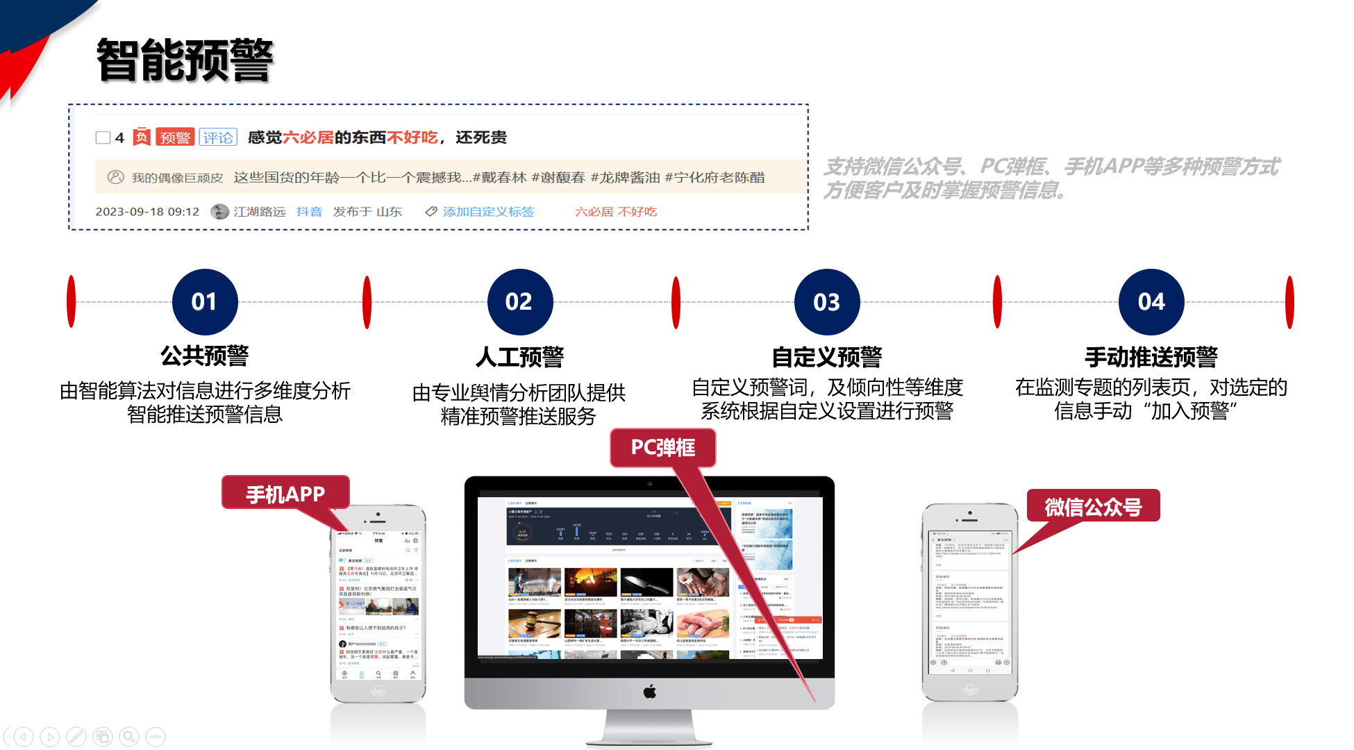 智能预警:融合海量标注数据与机器学习,实现高精准预警。支持PC/APP/微信多级提醒;实时监控平台热榜,属地信息第一时间告警。